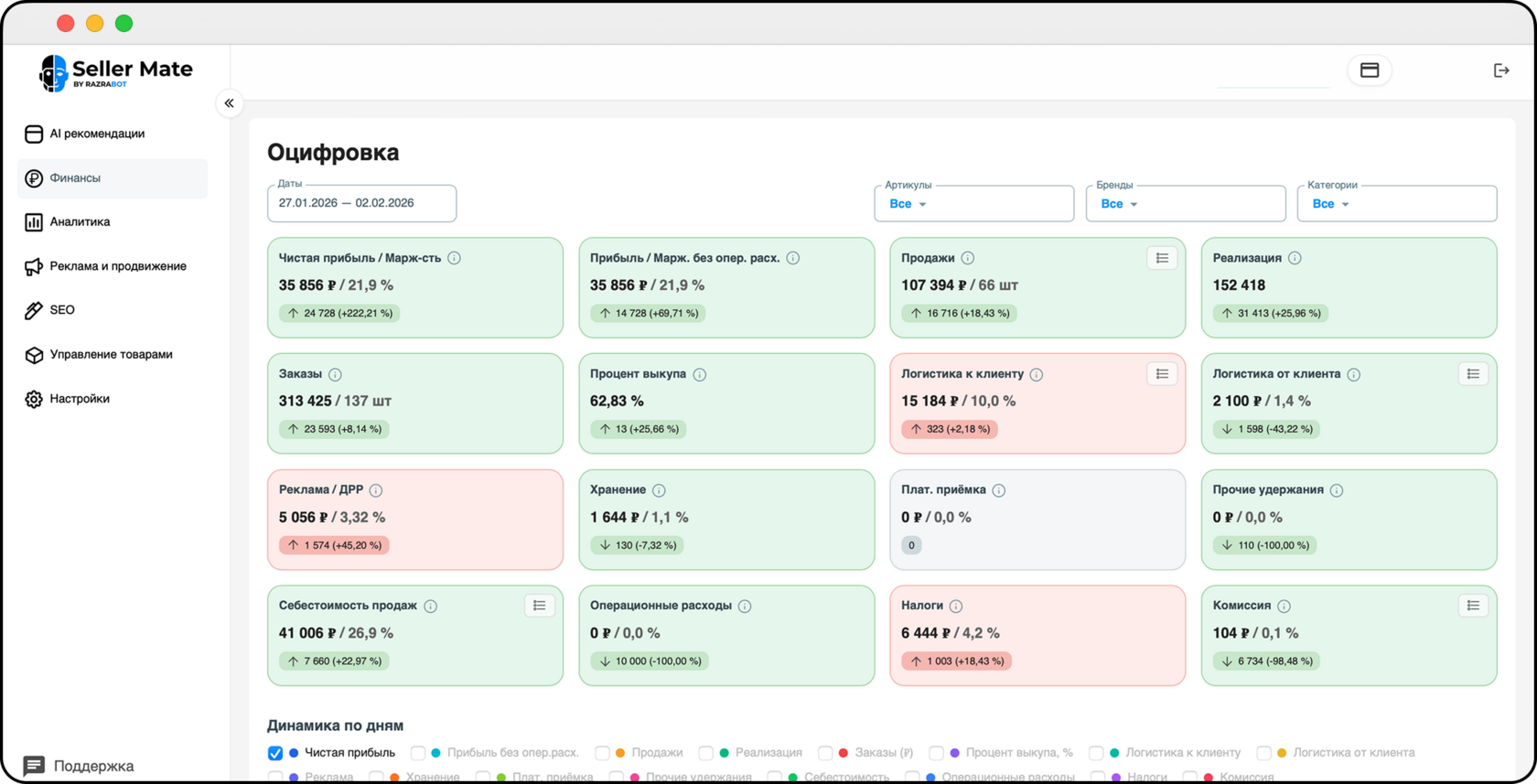 Попробуйте Seller Mate прямо сейчас – он быстро и наглядно покажет, где растет ваш бизнес и что его тормозит. А еще наш бот в Telegram будет каждое утро отправлять вам ваши показатели.