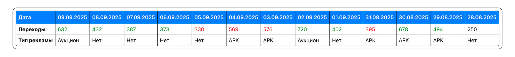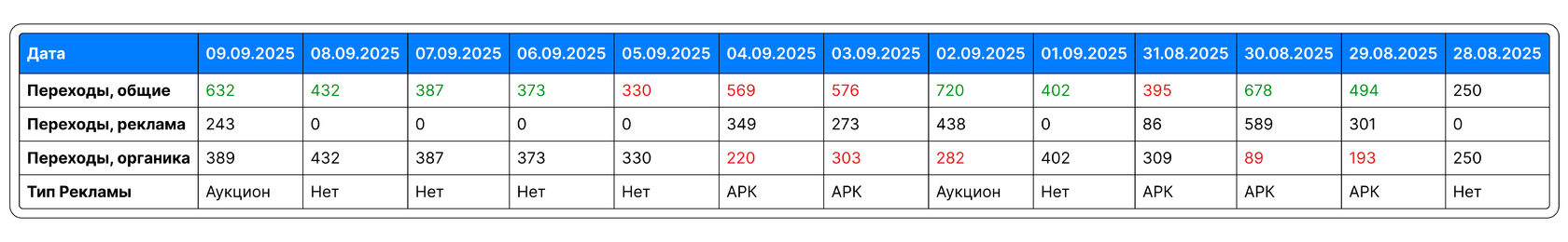 Здесь видно: в дни, когда реклама включалась, органика резко падала — иногда в два раза ниже средней. Неприятный факт, согласитесь. Получается, мы платим деньги, чтобы получить больше кликов (и, как следствие, заказов), а на самом деле бесплатный трафик просто съедается