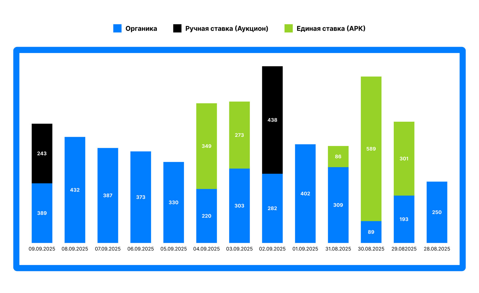 На первый взгляд может показаться, что АРК выгоднее: можно выставить ставку ниже и работать эффективнее. Но в итоге именно АРК сильнее подвержен каннибализации — вы тратите деньги на клики, которые могли получить бесплатно. А бюджет выходит примерно как в аукционе. Тут нужно считать в каждом конкретном случае.