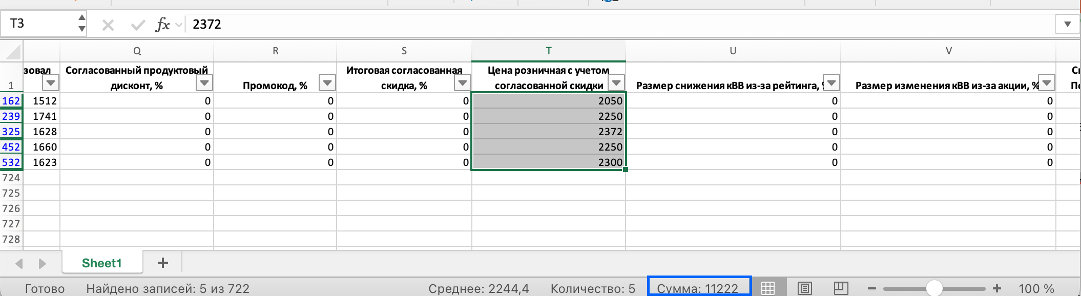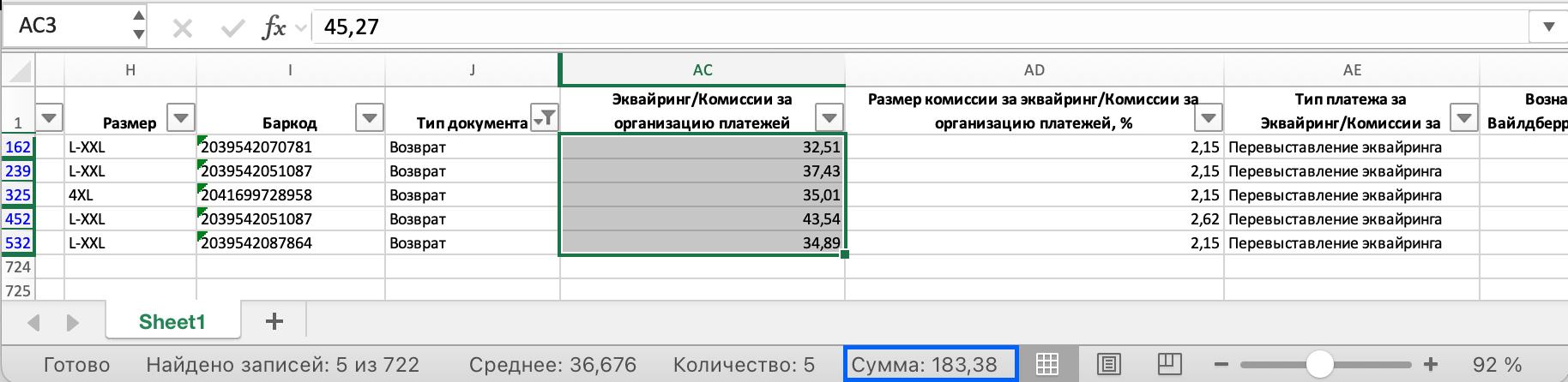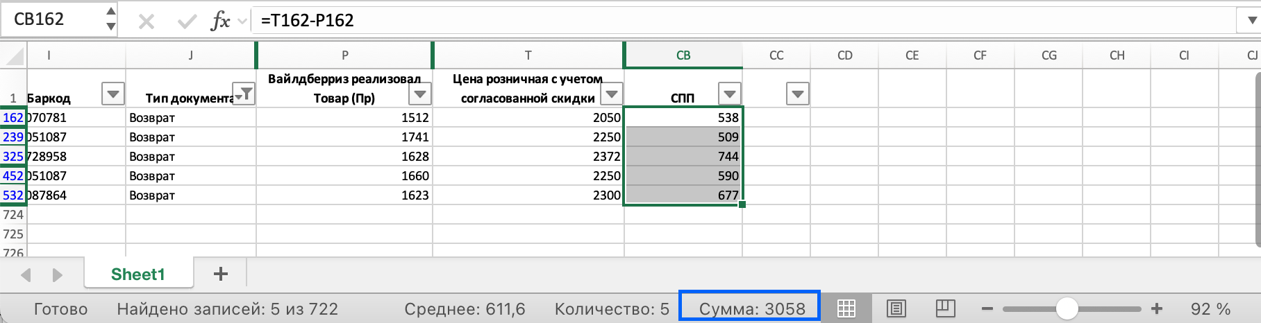 Посчитайте СПП для продаж: отфильтруйте строки с типом документа «Продажа» и основанием оплаты «Продажа», затем сложите значения в новом столбце. После этого отдельно посчитайте СПП для возвратов, выбрав «Возврат».