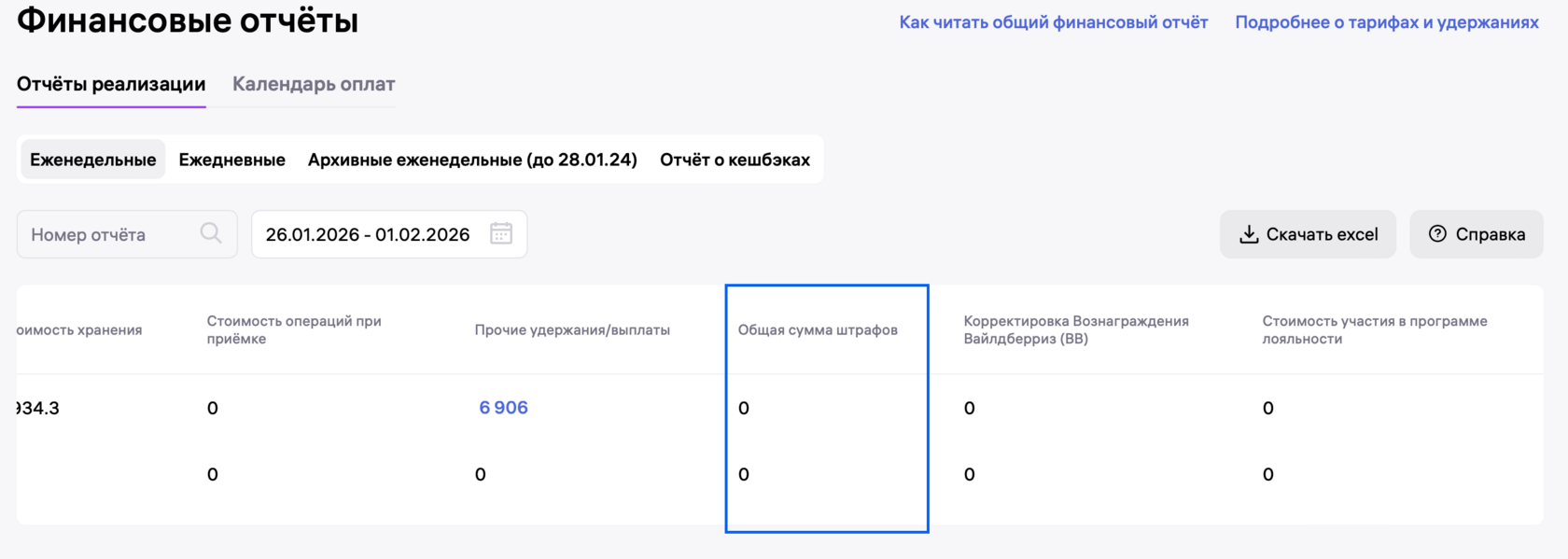 Для сверки просуммируем данные столбца “Общая сумма штрафов” из двух детализаций за выбранный период. Затем для сверки необходимо скачать 2 фин.отчета за выбранный период и для удобства объединить их в один файл. В столбце “Обоснование для оплаты” выбираем “Удержание”. Необходимо суммировать значения в столбце “Удержания”. В нашем примере эти значения отсутствуют.