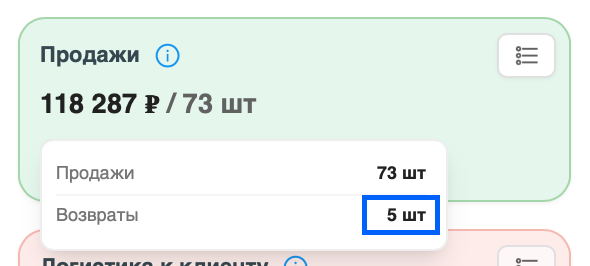 Полученный результат сравните с показателем «Возвраты» в детализации виджета "Продажи".