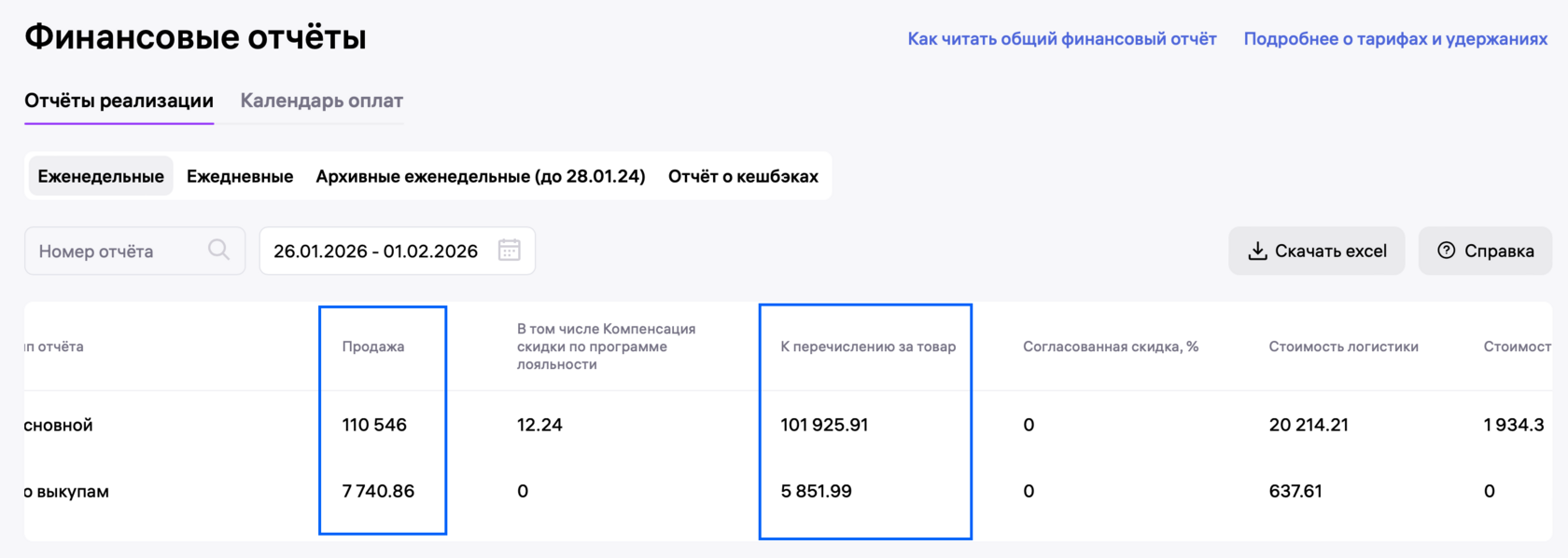 Большинство показателей сверяются с финансовым отчетом о реализации. Важно учитывать, что данные за текущую, еще не завершенную неделю, берутся из ежедневных отчетов. В понедельник они автоматически заменяются данными из недельного отчета.