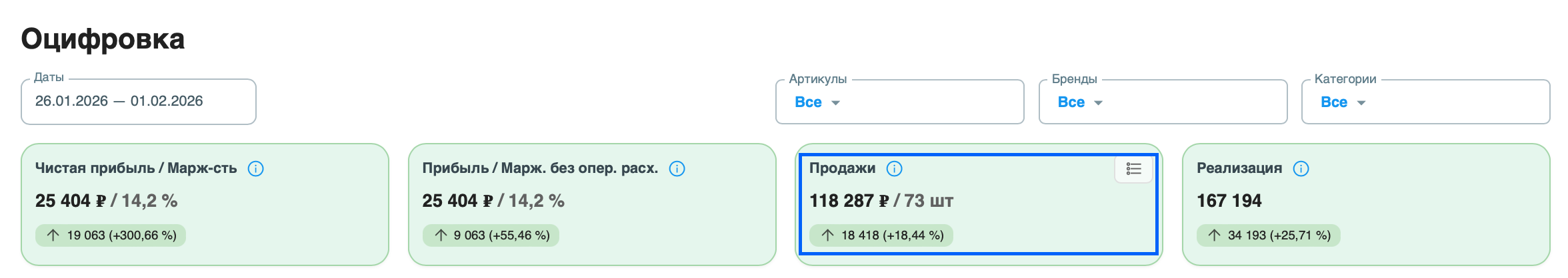 Итоговая реализация считается как сумма продаж минус сумма возвратов. Полученное значение сравните с виджетом «Реализация».