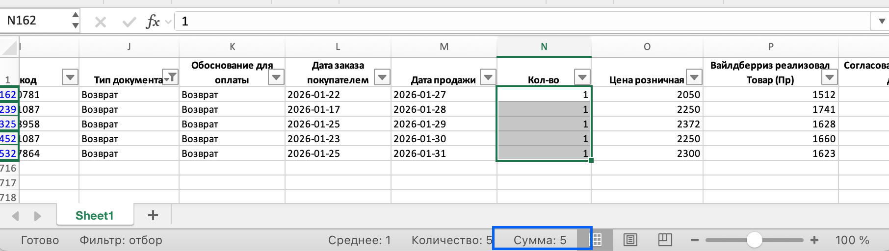 Отфильтруйте строки с типом документа «Возврат» и основанием оплаты «Возврат», затем сложите значения в столбце «Кол-во».