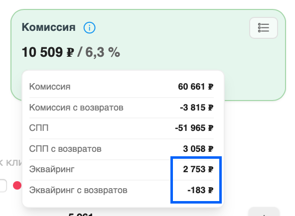 Полученные значения сравните со строкой «Эквайринг» и «Эквайринг с возвратов» в детализации виджета комиссии.